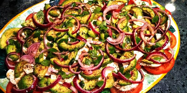 Romaine lettuce, diced red bell pepper, mozzarella cheese, black olives, cucumbers, dried sweet corn and your choice of dressing